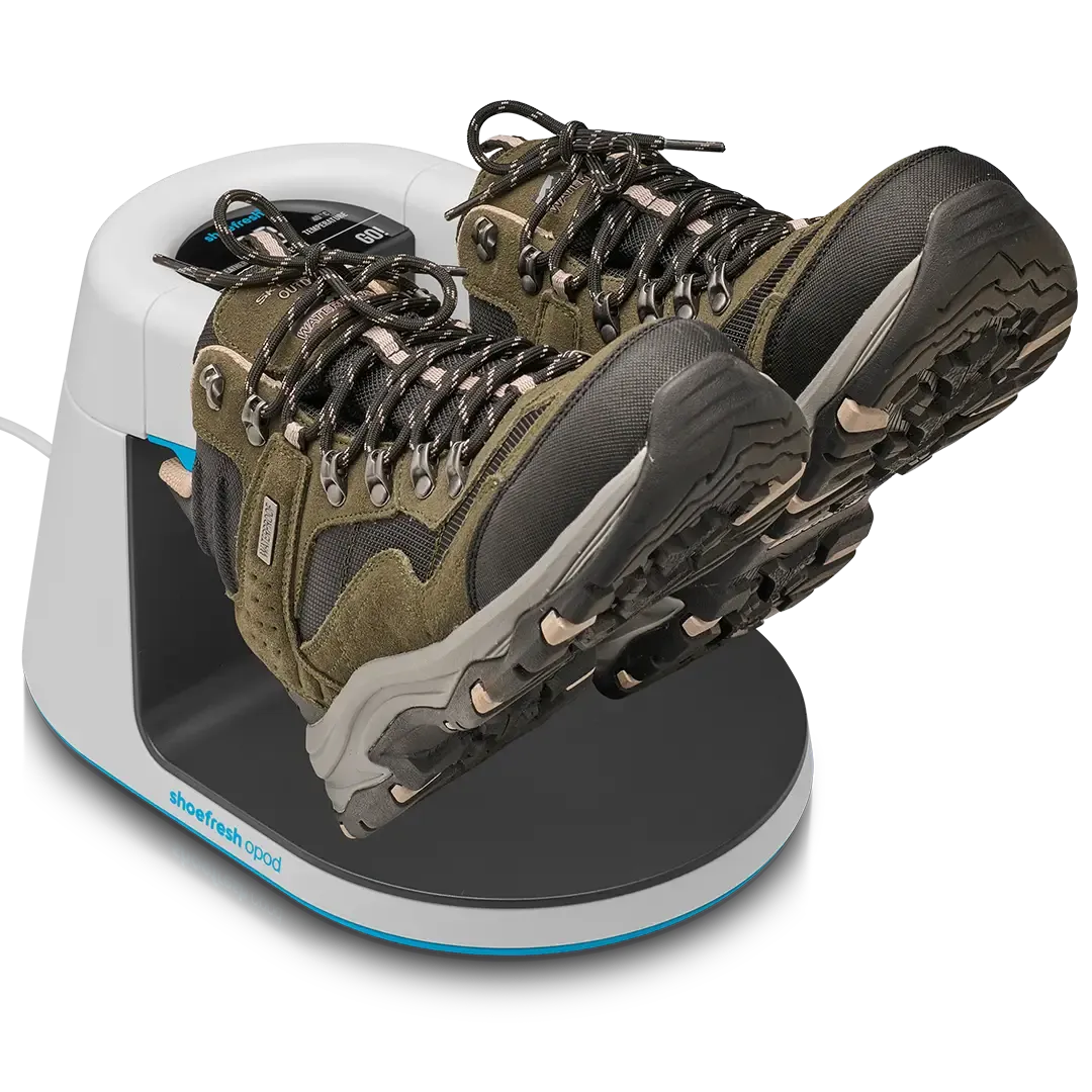 De Shoefresh Opod droogt je wandelschoenen binnen een uur en pakt bacteriën aan die de stank veroorzaken. Zo stap jij altijd in droge, frisse schoenen.